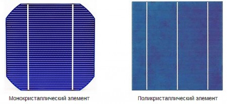 У монокристалічних елементів сонячних панелей – кути заокруглені, а поверхня однорідна. Округленность їх форм пов'язана з тим, що монокристалічний кремній, при його виробництві отримують в циліндричних заготовках. Колір від темно-синього до чорного з антивідбиваючим покриттям або сірий без покриття. Зовнішній вид однорідний.